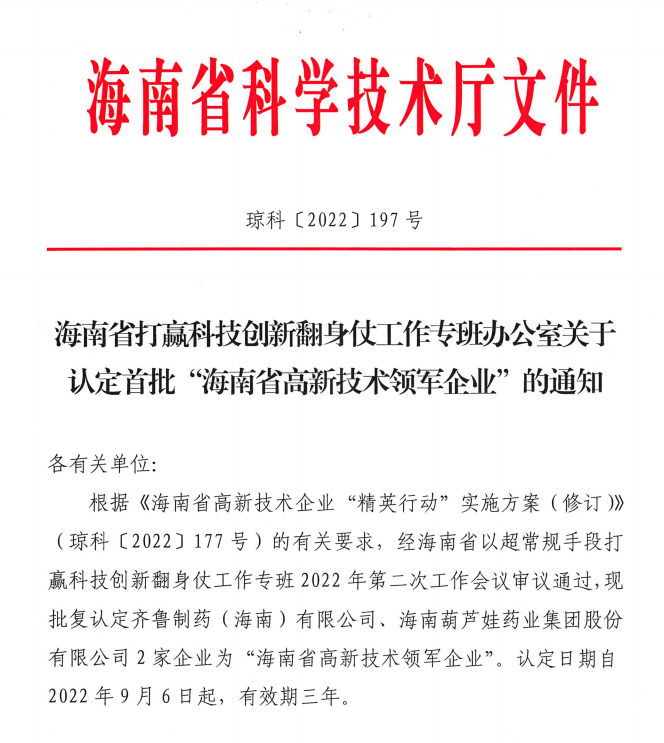 近日,海南省科学技术厅发布的《海南省打赢科技创新翻身仗工作专班办公室关于认定首批“海南省高新技术领军企业”的通知》中显示,批复认定海南东升国际药业集团股份有限公司等2家企业为“海南省高新技术领军企业”。认定日期自2022年9月6日起,有效期三年。